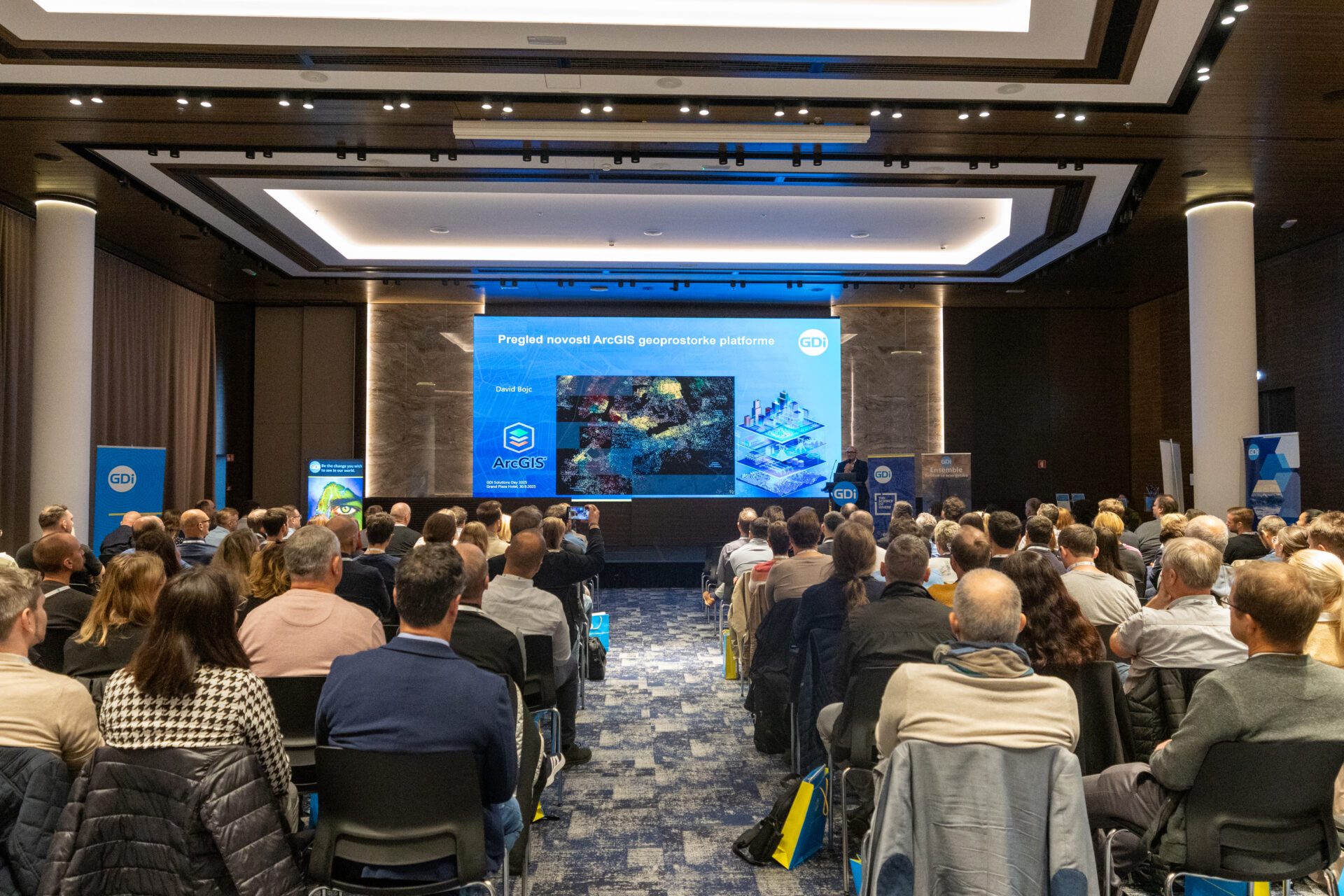 Letos je bil poseben poudarek na GeoAI – integraciji geoprostorskih podatkov z umetno inteligenco – ter vlogi lokacijske inteligence, ki jo poganja najnovejša generacija GIS-tehnologije. Predstavitve so zajemale tudi novosti iz sveta Esri, razvoj GDi lastnega portfelja Ensemble OSS ter praktične primere uporabe naprednih analitičnih orodij.